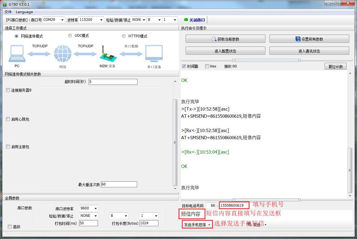2.也可以用軟件上的發(fā)送手機(jī)短信,但是注意:這種其實(shí)也是通過AT指令發(fā)送短信的,也需要先進(jìn)入配置狀態(tài)的,否則無法發(fā)送成功