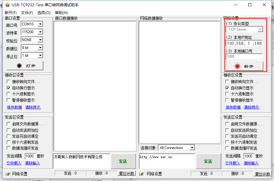 (1)打開網(wǎng)絡(luò)調(diào)試助手,設(shè)置協(xié)議類型為TCP Server,本地IP地址為上述網(wǎng)卡中看到的IP地址,即192.168.1.100,端口號要與G781中設(shè)置的端口號一致。點(diǎn)擊開始監(jiān)聽。