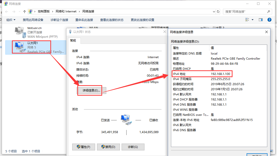 (3)打開網(wǎng)絡共享中心,雙擊對應的網(wǎng)絡適配器,點擊屬性,選擇IPV4,點擊屬性,修改電腦為自動獲取IP,然后點擊確定。(如果電腦本來就是自動獲取IP,這一步可以跳過)點擊詳細信息可以查看到電腦獲取的IP地址: