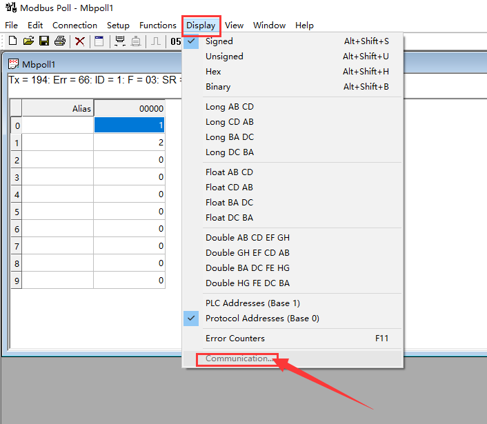 (9)點擊Display---Communication…,打開數(shù)據(jù)監(jiān)控界面,可以看到,串口端的modbus RTU格式的數(shù)據(jù)傳輸?shù)骄W(wǎng)絡端變成了Modbus TCP格式的