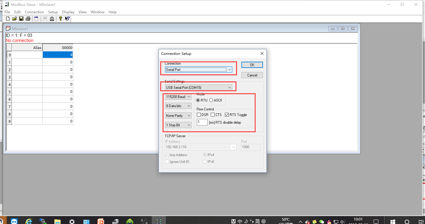 設置Modbus poll,點擊Connection----connect,設置參數(shù)如下圖所示,選擇Modbus TCP/IP,填寫對應的服務器的IP192.168.1.1和端口號1000.點擊OK