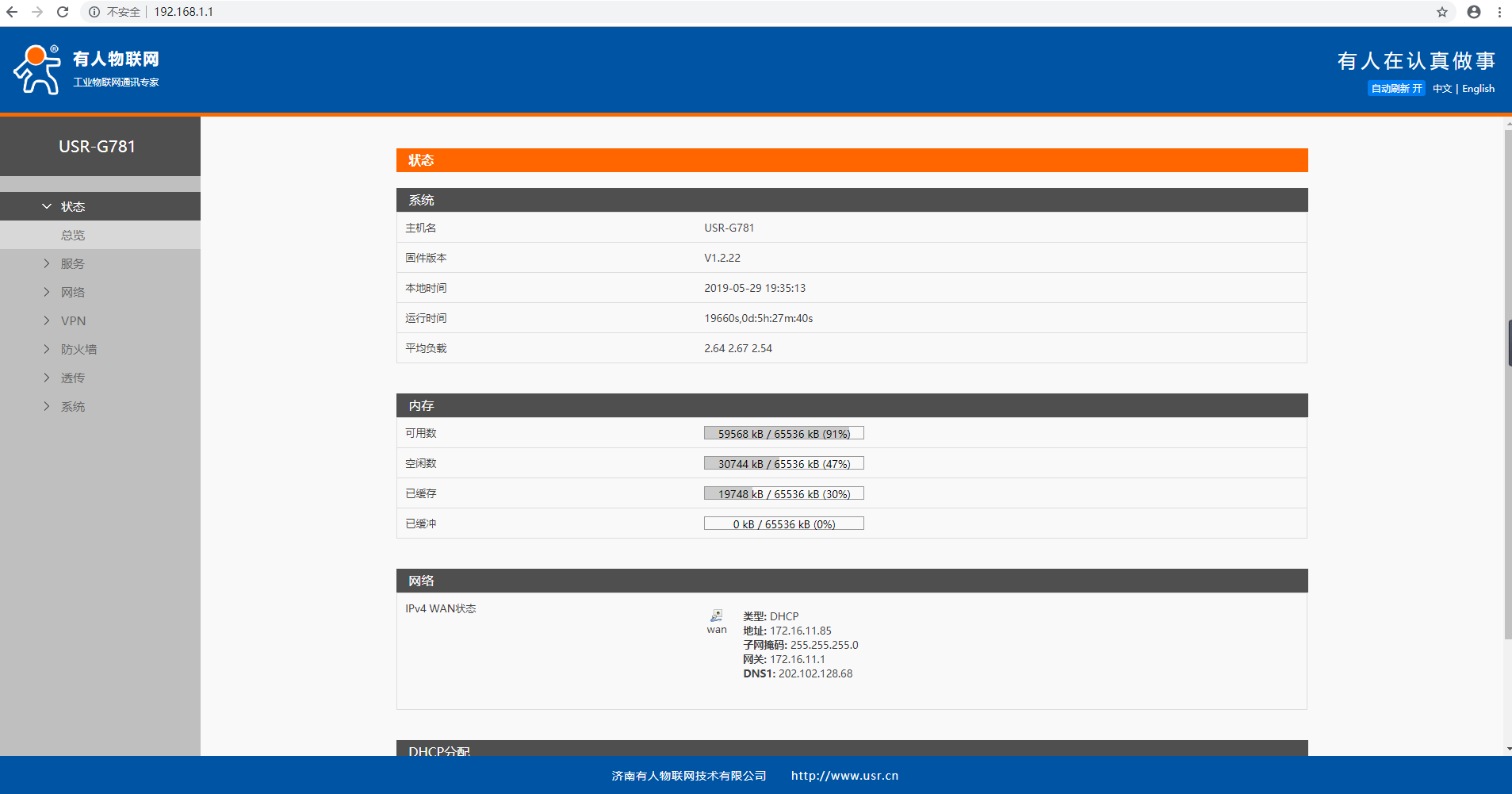 如步驟2所示,PC獲取到IP192.168.1.1,IPV4 默認(rèn)網(wǎng)關(guān)192.168.1.1即G781的LAN口IP。打開(kāi)瀏覽器,在地址欄輸入192.168.1.1后回車,彈出登錄界面,填寫(xiě)用戶名密碼(出廠默認(rèn)都是admin)點(diǎn)擊確認(rèn),即可進(jìn)入配置網(wǎng)頁(yè)。在狀態(tài)----總覽頁(yè)面可以看到,當(dāng)前固件版本是V1.2.22: