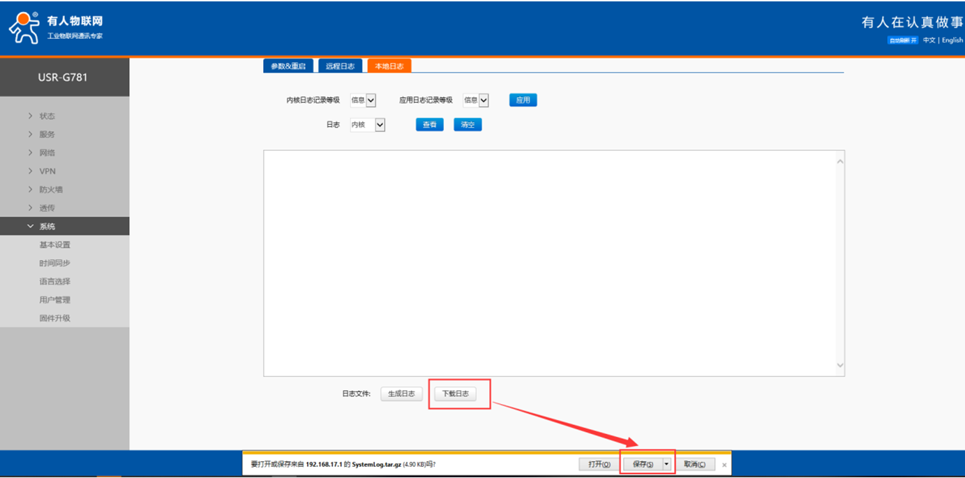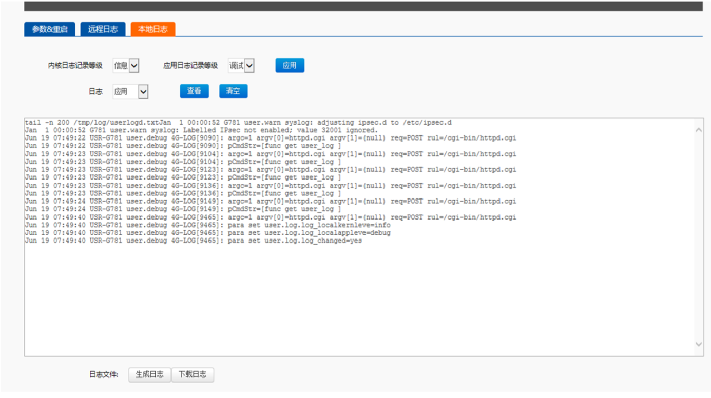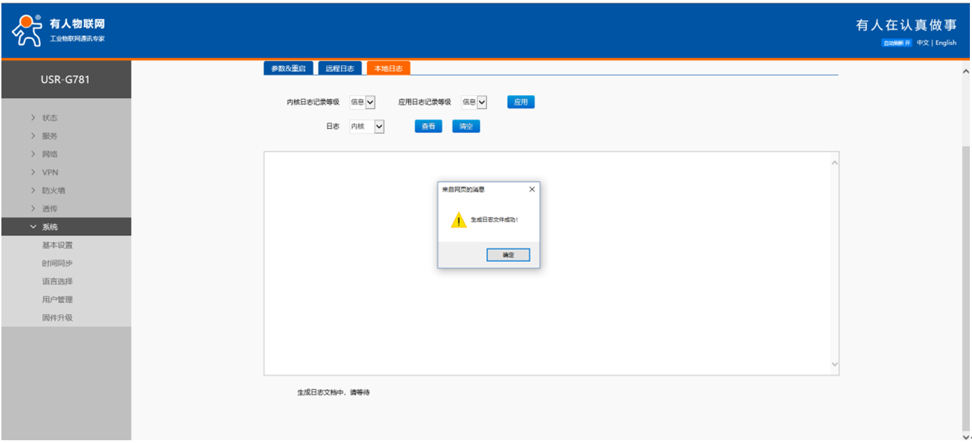 支持日志文件導(dǎo)出(先生成后導(dǎo)出),(不要修改日志等級(jí)),先點(diǎn)擊生成日志,后點(diǎn)擊下載日志。之后會(huì)生成一個(gè)壓縮包,即日志文檔。