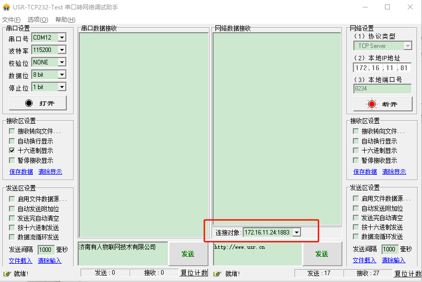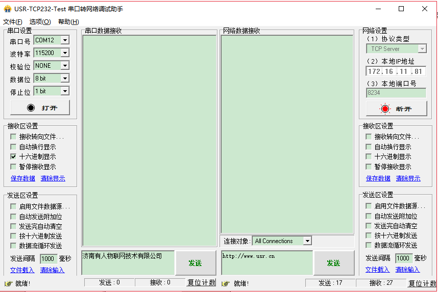 打開(kāi)USR-TCP232-Test串口轉(zhuǎn)網(wǎng)絡(luò)調(diào)試助,下載地址http://m.lifj.com.cn/Download/27.html