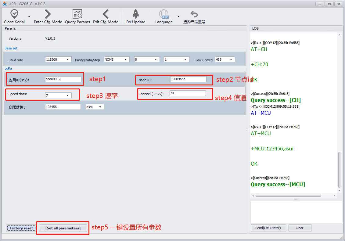 設(shè)置應(yīng)用ID、信道、速率。在下圖所示區(qū)域設(shè)置應(yīng)用ID為aaaa0002、速率等級(jí)設(shè)為7、信道設(shè)為70,然后點(diǎn)擊“一鍵設(shè)置所有參數(shù)”。應(yīng)用ID要與集中器設(shè)置的應(yīng)用ID一致,信道要與集中器通道1設(shè)置的信道一致,速率要與集中器通道1設(shè)置的速率一致,在同一個(gè)集中器的LoRA網(wǎng)絡(luò)內(nèi)節(jié)點(diǎn)的應(yīng)用ID要保證唯一。節(jié)點(diǎn)ID為206標(biāo)簽上表示的ID. 設(shè)置完成關(guān)閉串口。