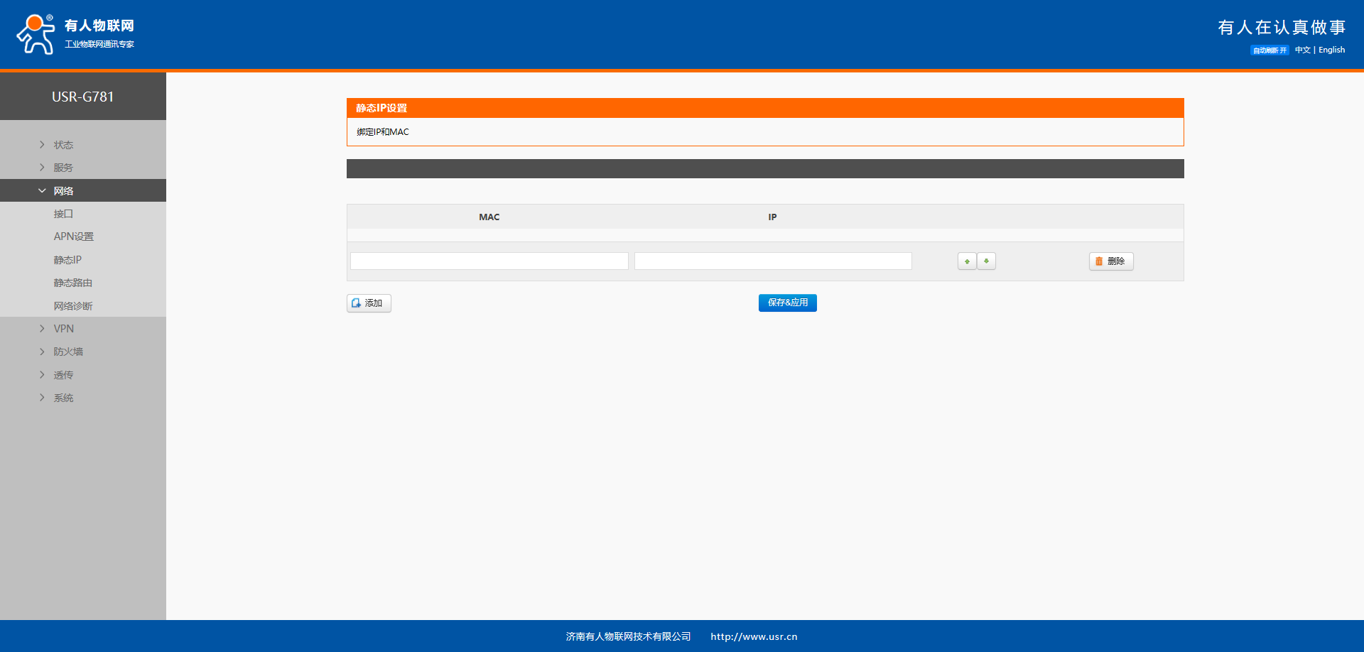 1、 進(jìn)入G781的設(shè)置網(wǎng)頁(yè),進(jìn)入網(wǎng)絡(luò)------靜態(tài)IP設(shè)置界面,如下圖所示。在該界面可以設(shè)置MAC和IP綁定,從而讓設(shè)備能夠以固定IP接入路由器: