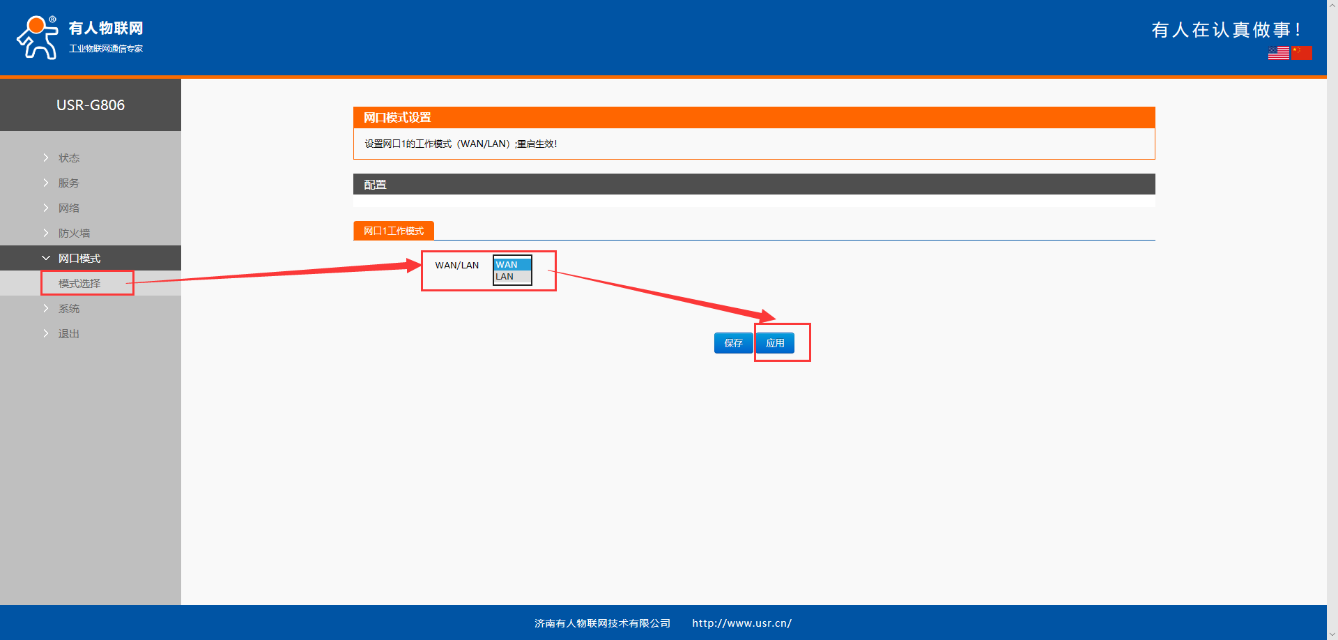 3、進入網(wǎng)口模式----模式選擇。WAN/LAN口出廠默認WAN模式,可以修改為LAN模式,然后點擊應用