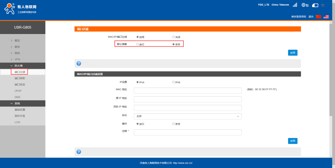 2、防火墻---端口過濾,MAC/IP/端口過濾選擇“啟用”,默認(rèn)策略選擇“丟棄”。點(diǎn)擊“應(yīng)用”。