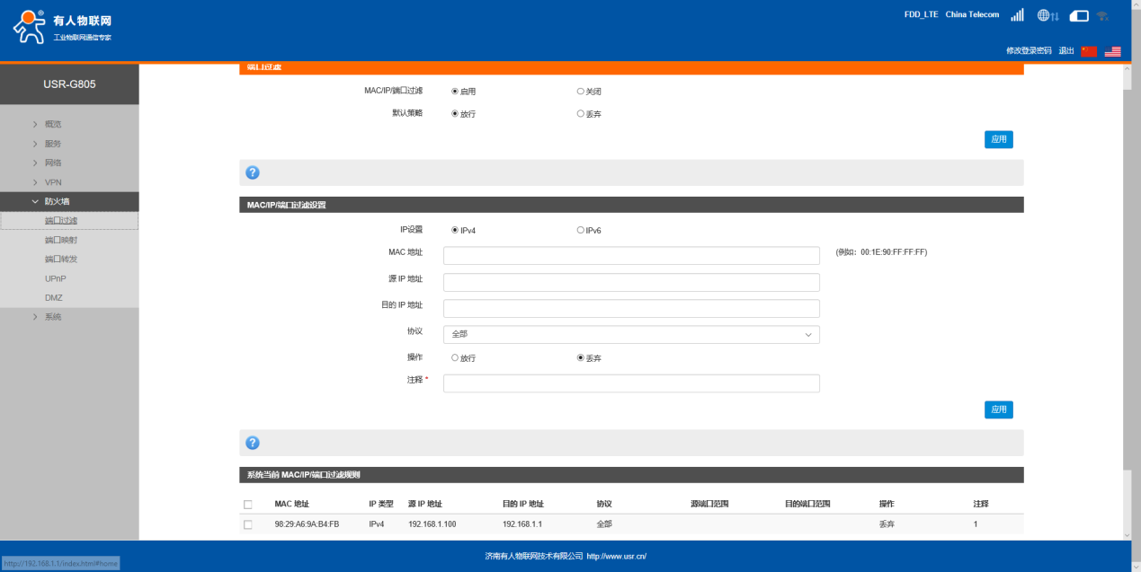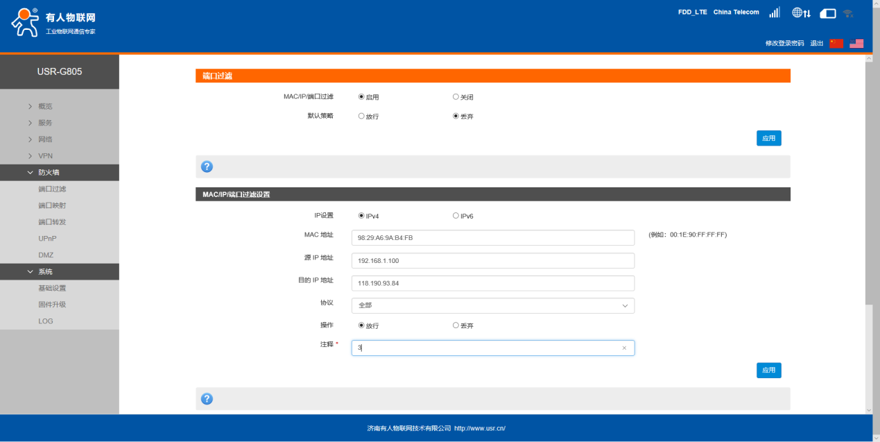 填寫PC的MAC、IP,目的IP填寫G805的LAN口IP,協(xié)議選擇全部,操作選擇“放行”。設(shè)置完成后點(diǎn)擊應(yīng)用。