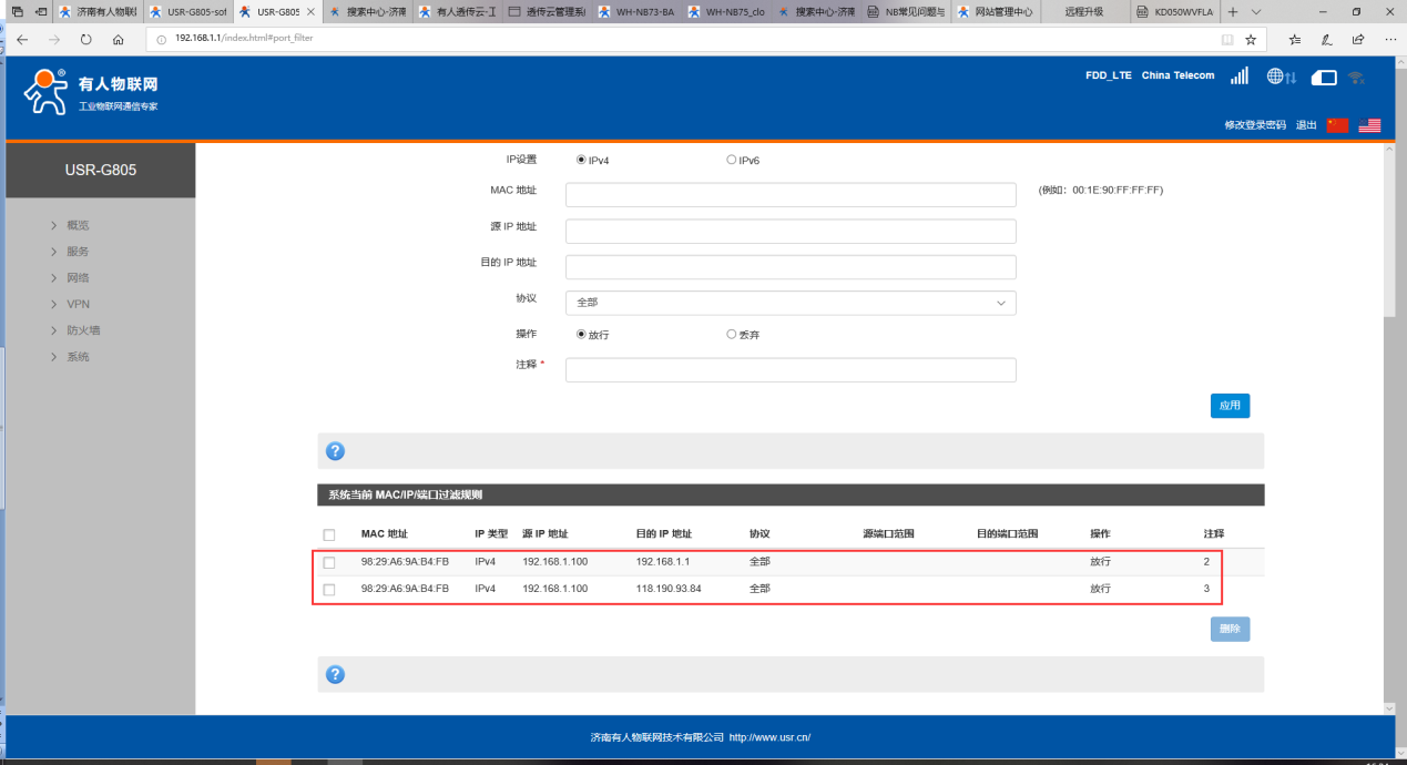 7、按照軟件設(shè)計(jì)手冊(cè)中的端口過濾的說明,添加后PC仍然可以ping通并訪問G805