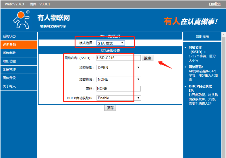 c. 模式選擇為STA模式,點擊保存。