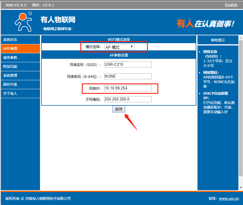 c. 將wifi模式選擇改為 STA模式, 可以填寫或搜索您要連接的AP名稱、密碼等參數(shù)。如果需要給模塊設置固定IP,請在下面的“DHCP自動獲取IP”選項改為“Disable”,設置完成后需要點擊保存應用。