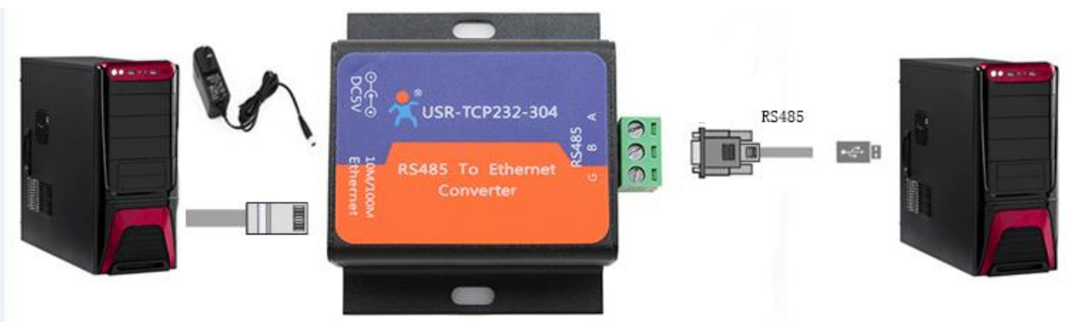 將304接入標(biāo)準(zhǔn)得適配器電源,將304得網(wǎng)口和電腦得網(wǎng)口鏈接起來,通過USB轉(zhuǎn)485串口線鏈接到電腦上。如圖所示: