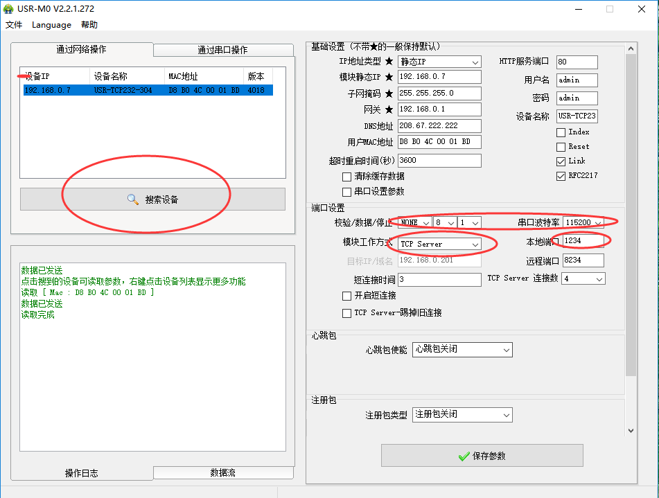 2. 打開設(shè)置軟件:USR-M0_V2.2.1.272,點(diǎn)擊“搜索設(shè)備”,搜索到設(shè)備后選中設(shè)備,修改304得參數(shù),串口參數(shù)測(cè)試時(shí)可以默認(rèn)(如果需做改動(dòng),可以直接修改),設(shè)置“模塊工作方式”為“TCP Sever”,“本地端口”設(shè)置為“1234”,然后點(diǎn)擊“保存參數(shù)”。
