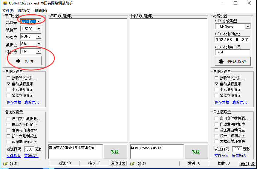 3. 打開測(cè)試軟件:USR-TCP232-Test-V1.3,選擇相應(yīng)com口(我得電腦右擊->屬性->設(shè)備管理器,com口中可以看到),然后將串口得設(shè)置和設(shè)備得串口參數(shù)一一對(duì)應(yīng),對(duì)應(yīng)好打開com口。如圖所示: