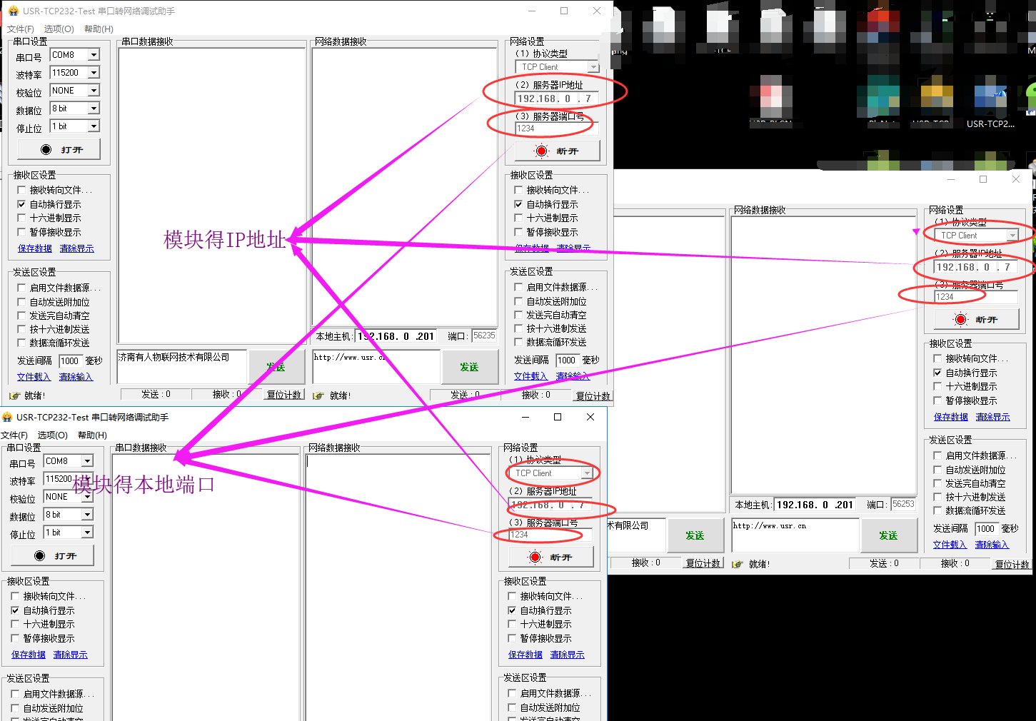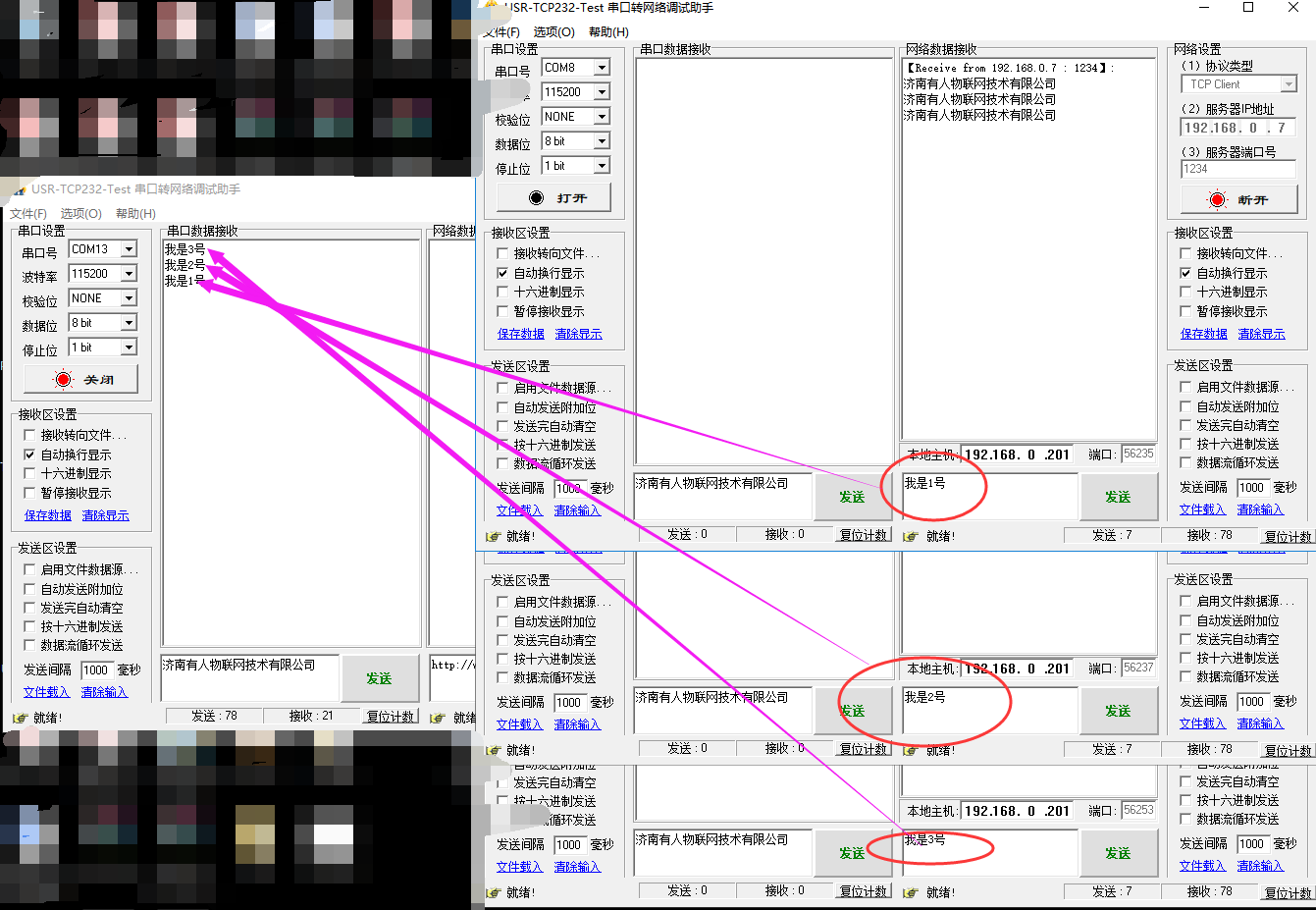 4. 打開3個(gè)測(cè)試軟件:USR-TCP232-Test-V1.3,分別與我們得模塊建立socket鏈接,如圖所示: