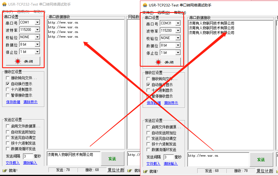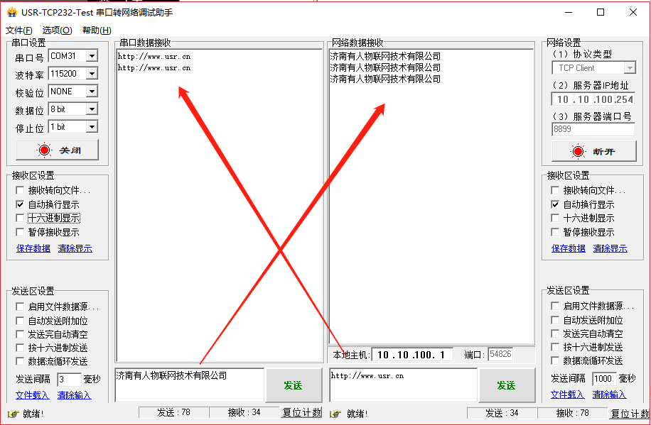 (3) 打開USR-TCP232-TEST軟件測試