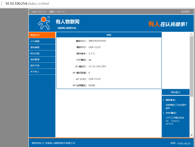 1、將模塊焊接到測試底板上,測試板串口連接電腦串口,電腦連接WiFi。在電腦無線搜索欄,搜索USR-C215,連接。此時電腦獲取到的ip為10.10.100.1