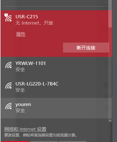 a. 將C215模塊接到測(cè)試底板上,測(cè)試板串口連接電腦串口,電腦連接WiFi。在電腦無線搜索欄,搜索USR-C215,連接。