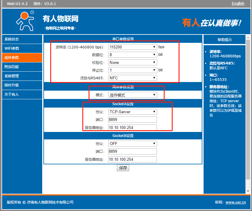c. 查看透?jìng)鲄?shù), 此處串口參數(shù)可以修改, Socket連接參數(shù)都可以修改,本案例使用默認(rèn)參數(shù),不做修改, 模塊做TCP Server端。 參數(shù)修改需要點(diǎn)擊保存,保存后會(huì)提示重啟, 可以把其他的參數(shù)設(shè)置完成一起重啟。