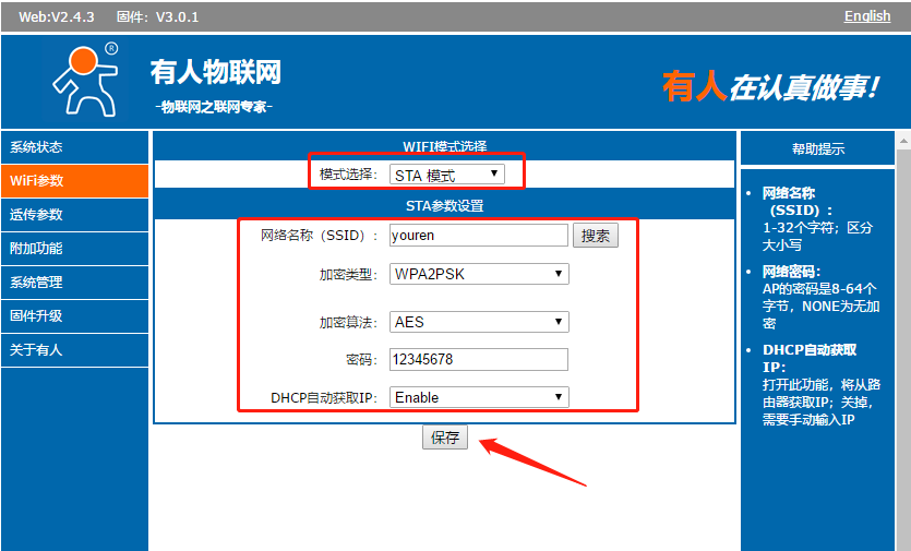 d. 將wifi模式選擇改為 STA模式, 可以填寫或搜索您要連接的AP名稱、密碼等參數(shù)。如果需要給模塊設(shè)置固定IP,請(qǐng)?jiān)谙旅娴摹?/span>DHCP自動(dòng)獲取IP”選項(xiàng)改為“Disable”,設(shè)置完成后需要點(diǎn)擊保存應(yīng)用。