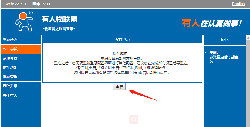點(diǎn)擊重啟按鈕,模塊設(shè)置生效,等待模塊重啟完成,如果設(shè)置正確,模塊就會(huì)去連接路由器wifi。