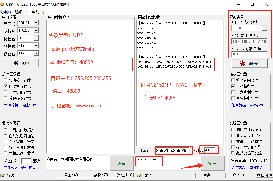 使用串口及網(wǎng)絡(luò)調(diào)試助手軟件設(shè)置為UDP 模式,設(shè)置目標(biāo)主機(jī)為4個(gè)255,為廣播地址,廣播端口為48899.發(fā)送廣播指令m.lifj.com.cn 返回模塊獲取到的IP,記錄C215的IP.(關(guān)于UDP廣播端口和廣播指令在附加功能內(nèi)可以查看和設(shè)置)。