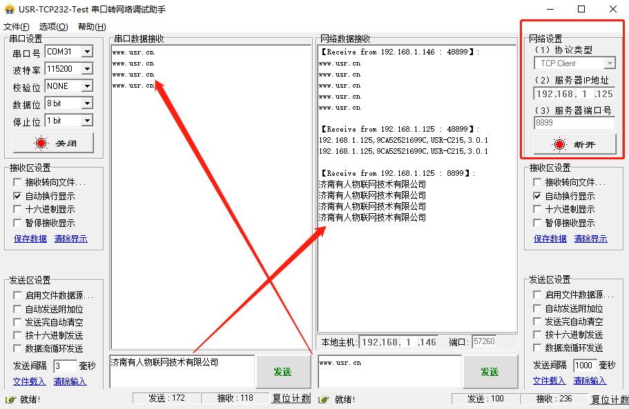 模塊的串口連接到電腦串口com31.然后網(wǎng)絡(luò)端口以TCP client的形式連接獲取到的IP:192.168.1.125.端口為8899. 實(shí)現(xiàn)串口數(shù)據(jù)發(fā)送到網(wǎng)絡(luò)端口,網(wǎng)絡(luò)數(shù)據(jù)發(fā)送到串口端口。