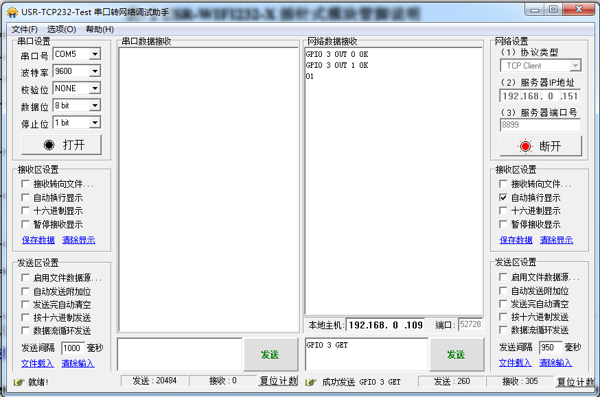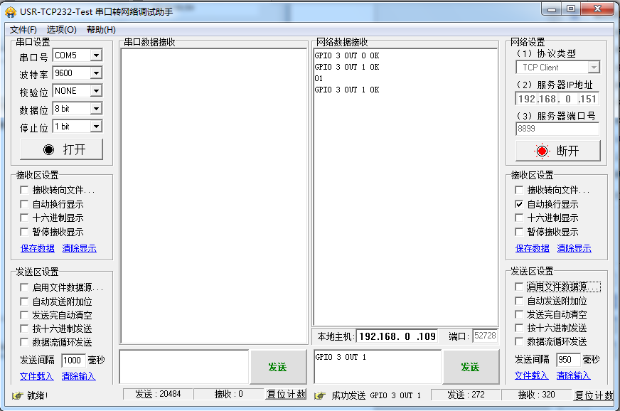 6:通過(guò)網(wǎng)絡(luò)發(fā)送GPIO指令。 發(fā)送第3腳輸出高電平。