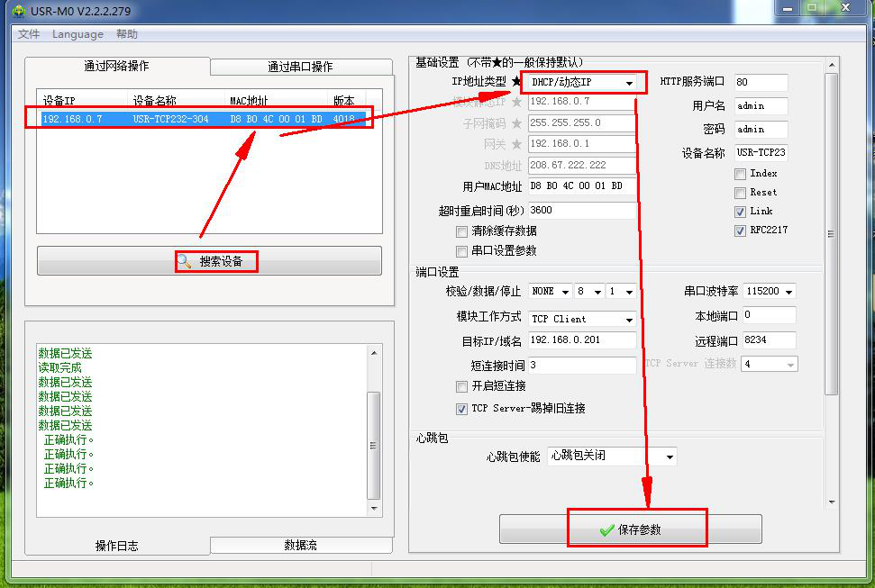 1、 用M0設(shè)置軟件將304設(shè)置DHCP模式,連接可以上網(wǎng)的路由器。