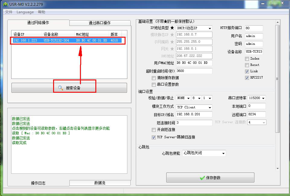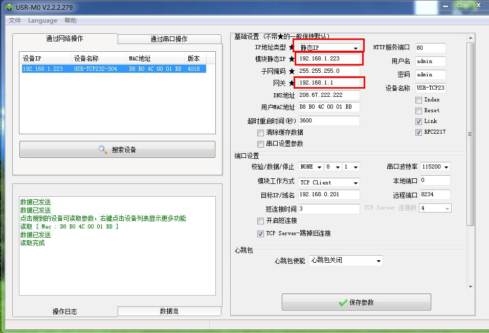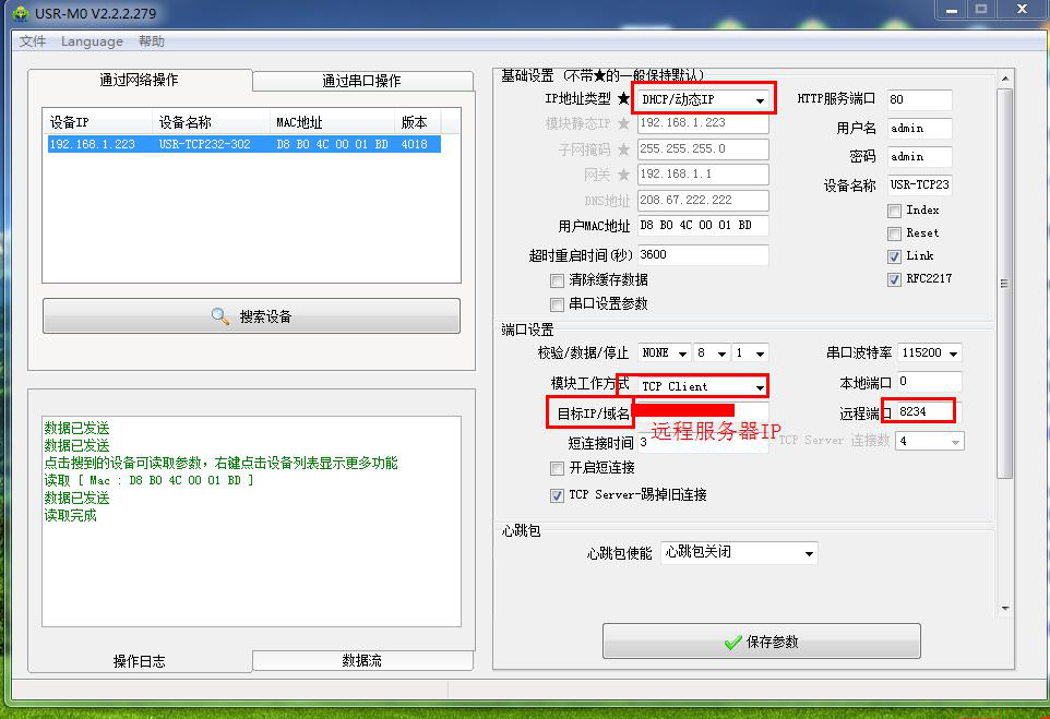 2、 用M0設(shè)置軟件將304設(shè)置TCP client,目標(biāo)IP填遠(yuǎn)程服務(wù)器地址。遠(yuǎn)程端口填遠(yuǎn)程服務(wù)器的端口號。