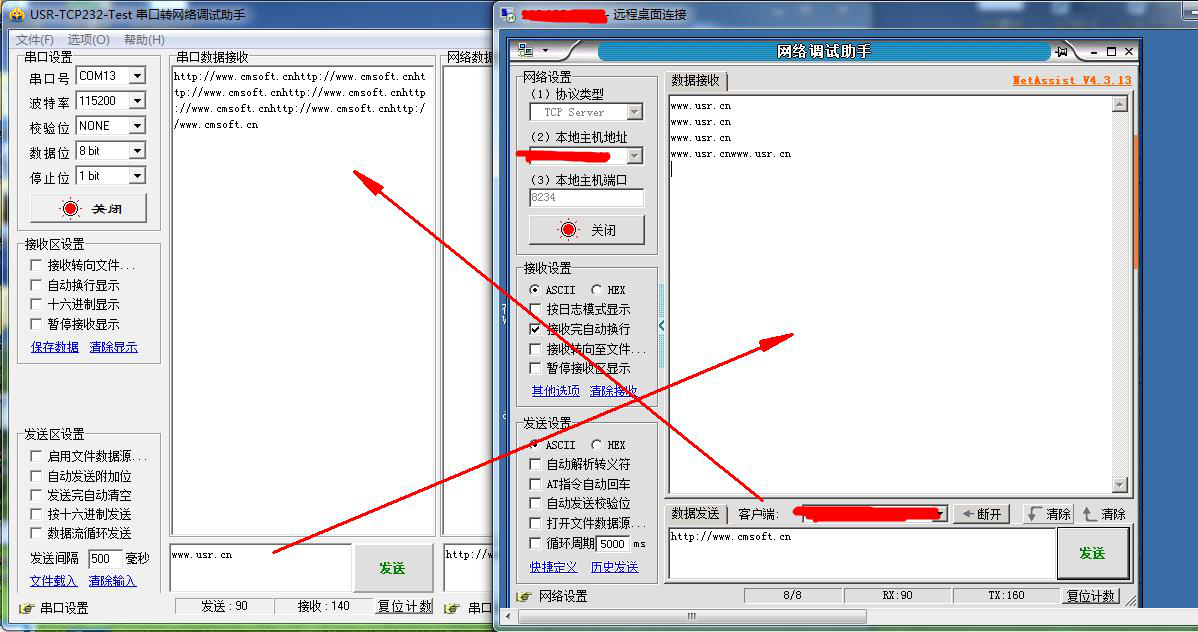 3、 304連接遠(yuǎn)程服務(wù)器成功,測試數(shù)據(jù)透傳