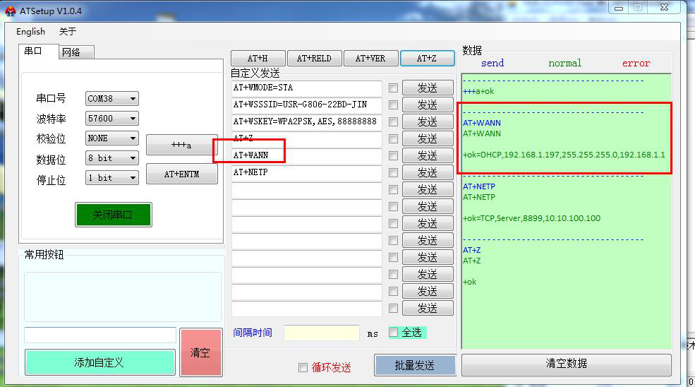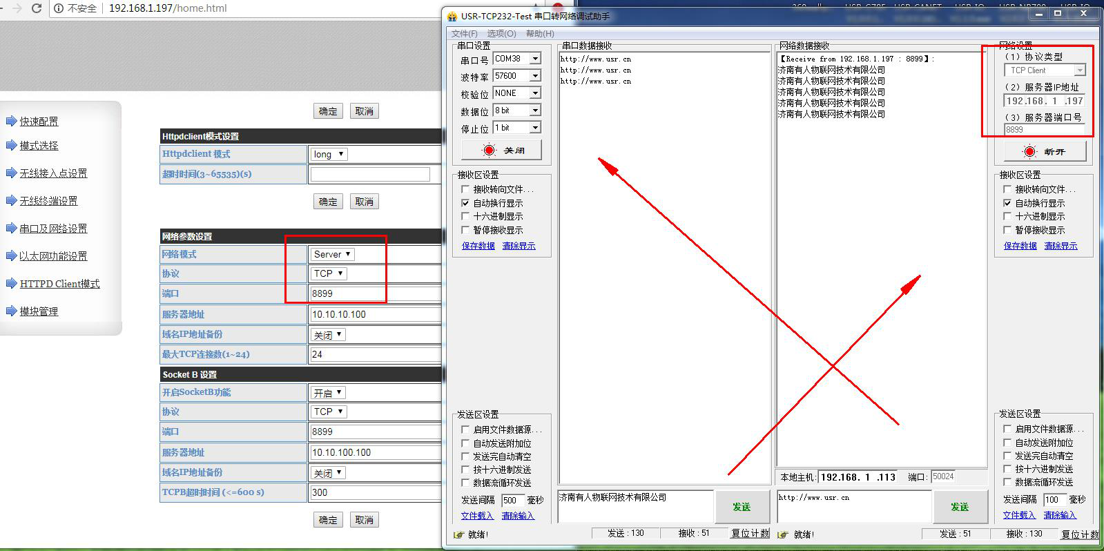 用USR-W610的IP 登錄USR-W610的網(wǎng)頁,然后修改W610的串口參數(shù)。測(cè)試4種工作模式下,串口和網(wǎng)絡(luò)的數(shù)據(jù)透?jìng)鳌?/span>