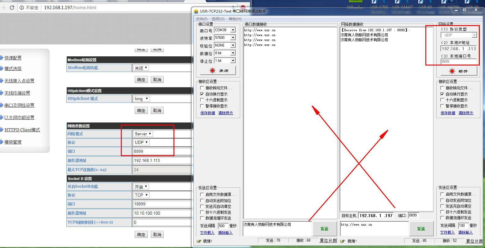 用USR-W630的IP 登錄USR-W630的網(wǎng)頁(yè),然后修改W630的串口參數(shù)。測(cè)試4種工作模式下,串口和網(wǎng)絡(luò)的數(shù)據(jù)透?jìng)鳌?/p>