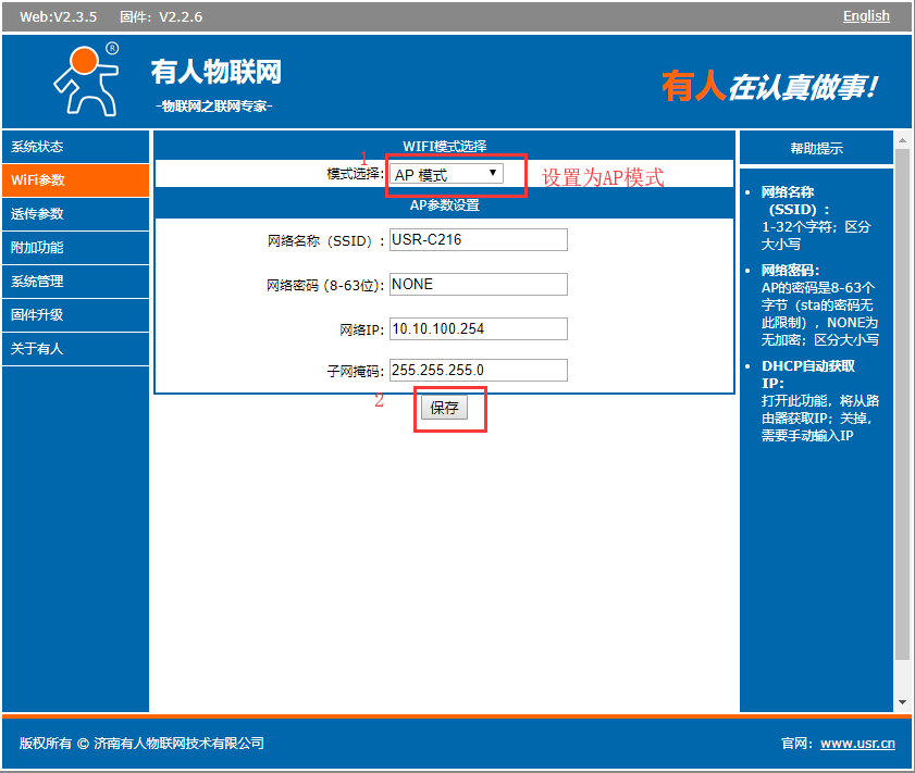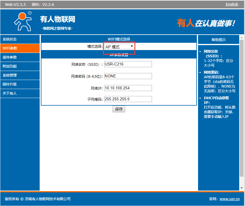 1、進入內(nèi)置網(wǎng)頁,216出廠默認AP模式,默認參數(shù):115200,N,8,1