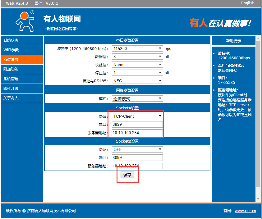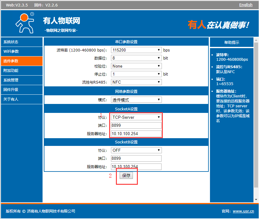 設(shè)為AP模式的216做server,此處以8899為例(端口號可設(shè)),ip地址為216本身的ip,設(shè)置完成后,點擊保存,點擊重啟,所配置的參數(shù)均在重啟后生效