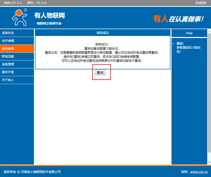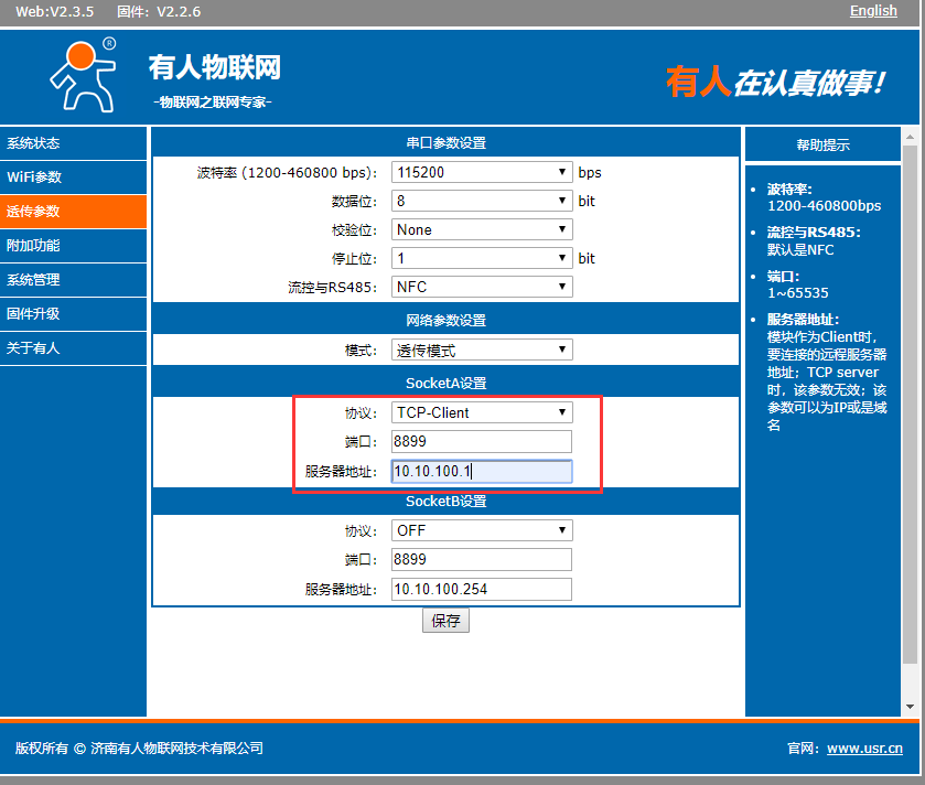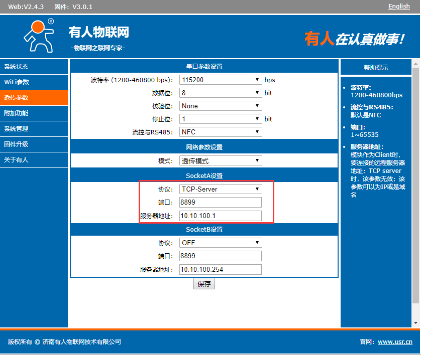4、設(shè)為AP模式的216做server,此處以8899為例(端口號可設(shè)),ip地址為10.10.100.1,設(shè)置完成后,點擊保存,點擊重啟,所配置的參數(shù)均在重啟后生效