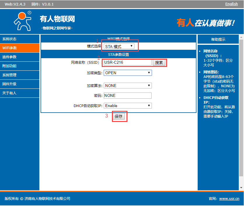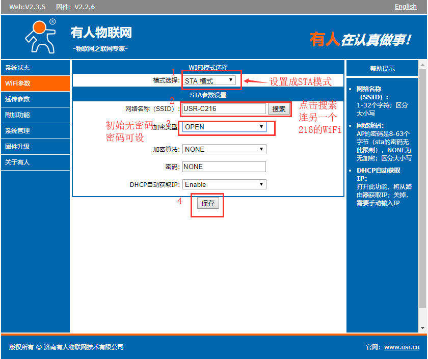 先將模塊設(shè)置為STA模式,保存,重啟。