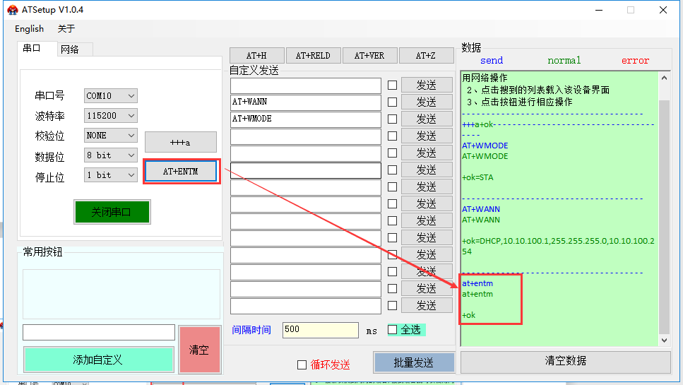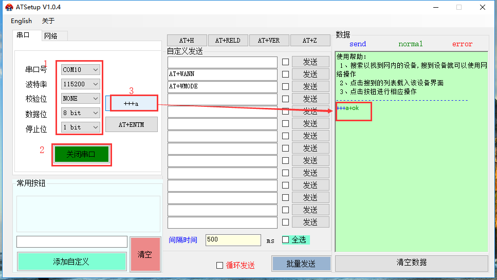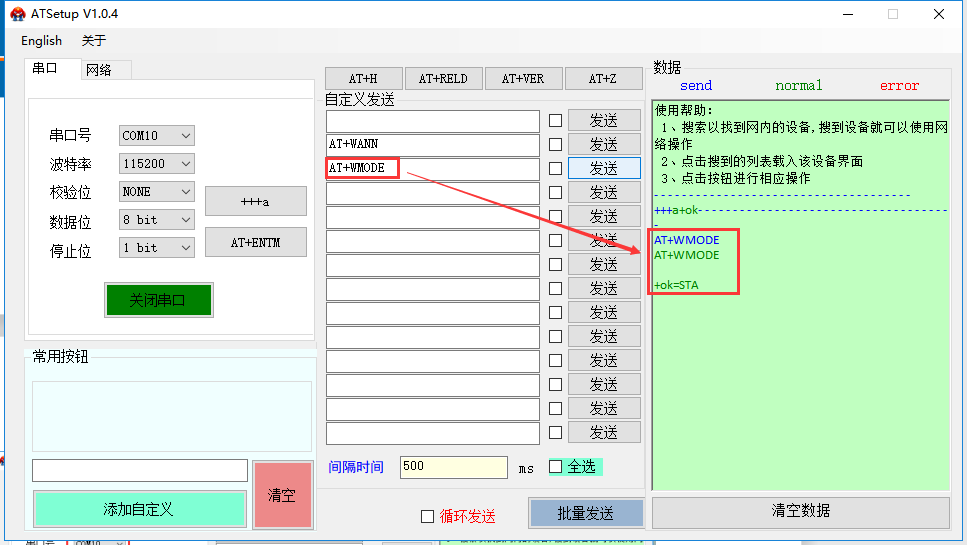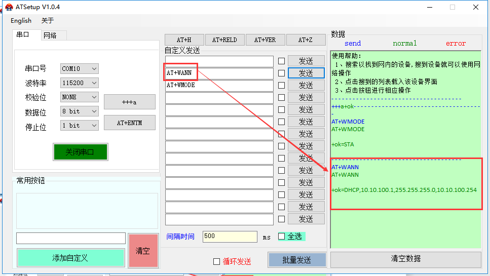 2、打開AT指令軟件,選擇相應(yīng)的串口號,以及串口參數(shù)(默認:115200,N,8,1),打開串口,點擊“+++a”進入配置狀態(tài),用AT指令:AT+WMODE查詢模塊所處工作模式,用AT+WANN查詢模塊的IP地址,退出配置狀態(tài),關(guān)閉串口。(其他AT指令您可以參考軟件設(shè)計手冊41頁)
