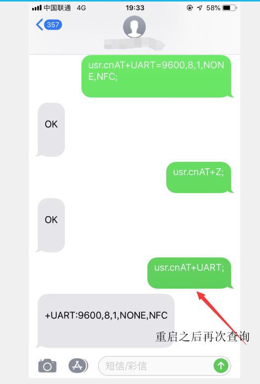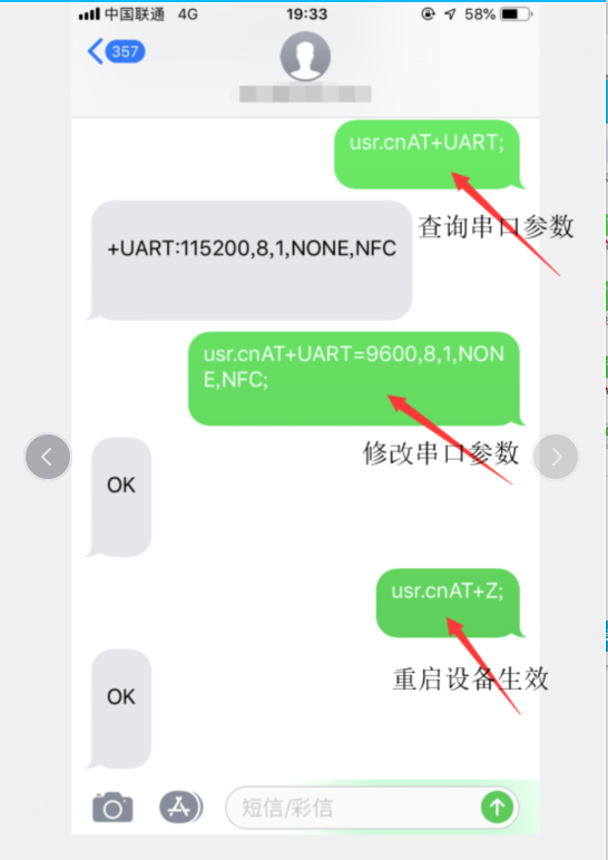 2.通過手機(jī)發(fā)送固定格式的短信給DTU內(nèi)的手機(jī)號(hào)。短信AT指令格式:命令密碼+AT指令,命令密碼出廠默認(rèn)是usr.cn。注意:AT指令后面要加英文分號(hào)和回車換行,本例以修改DR504的串口參數(shù)為例。如圖2所示