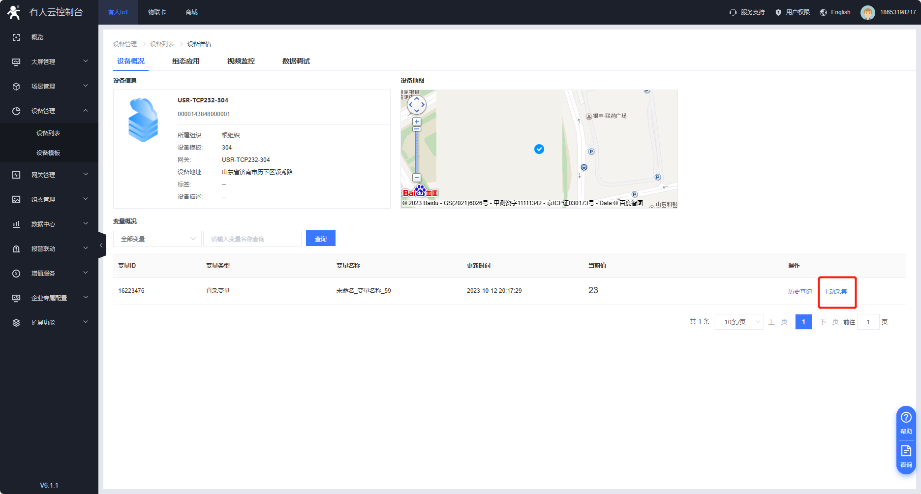 3、在有人云平臺上找到對應(yīng)的設(shè)備,點擊數(shù)據(jù)查看-主動采集??梢栽谟腥嗽破脚_查看設(shè)備傳輸?shù)拇跀?shù)據(jù)。
