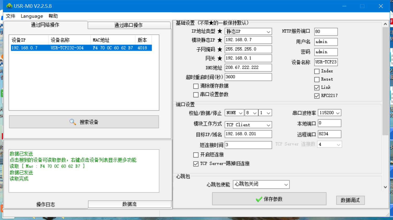 串口參數(shù): 跟USR-TCP232-304的串口參數(shù)保持一致