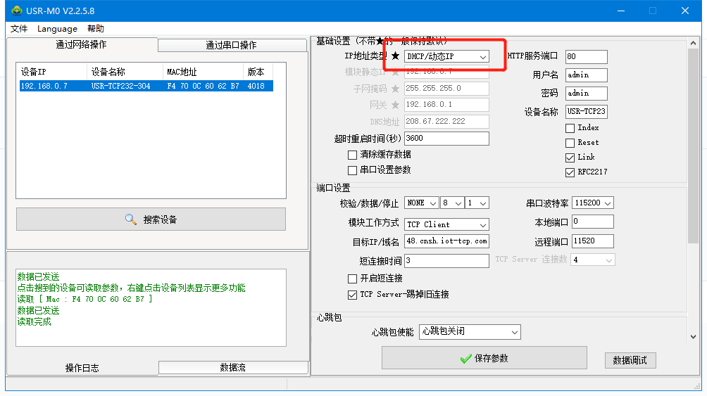 4、IP地址類型更改為DHCP/動態(tài)IP,設(shè)置完成后通過網(wǎng)線將304的網(wǎng)口接到路由器LAN口上面,給設(shè)備供網(wǎng)。工作方式選擇TCP Client,目標(biāo)IP:自己的云平臺接入地址,遠(yuǎn)程端口號:15000,設(shè)置完成后點擊保存參數(shù)。