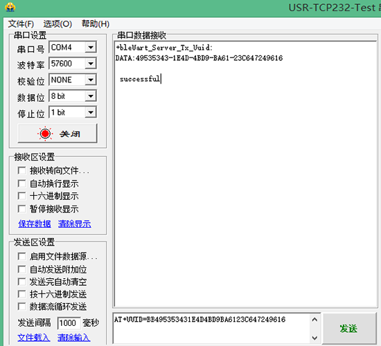 三、進入AT指令模式,更改BLE的UUID,3個UUID全部改完后,設(shè)置BLE工作模式為主模式,然后發(fā)送AT+Z重啟。