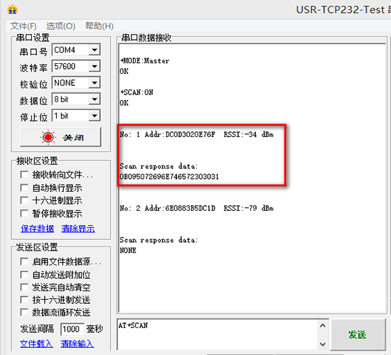5、紅框中的為藍牙打印機的地址,然后發(fā)送AT+CONN=1進行連接打印機