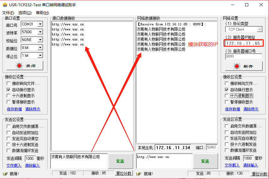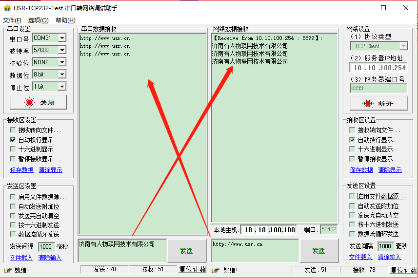 模擬數(shù)據(jù)收發(fā)測試,在實際應用中,串口應接在設備上,且模塊的串口參數(shù)與串口設備的參數(shù)一致。