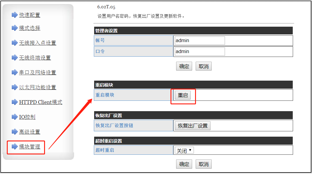 PC連接模塊無線SSID,打開瀏覽器地址欄輸出10.10.100.254,賬號密碼輸入admin,即可進入模塊內(nèi)置網(wǎng)頁,模塊網(wǎng)口直連電腦。