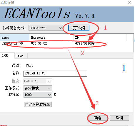 選擇設(shè)備類型為“USBCAN-V5”然后打開設(shè)備選擇Can1,點(diǎn)擊確定