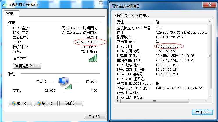 1:電腦搜索WiFi模塊的網(wǎng)絡,并連接上,查詢電腦獲取到的IP地址。