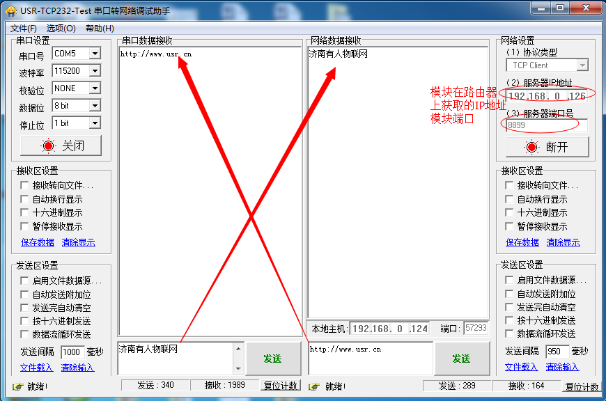 使用AT+WANN可以查詢到無線路由給模塊分配到的IP地址。通信地址就使用這個IP通信。以上網(wǎng)絡調(diào)試助手和虛擬串口軟件通信的IP都是以此IP為準。